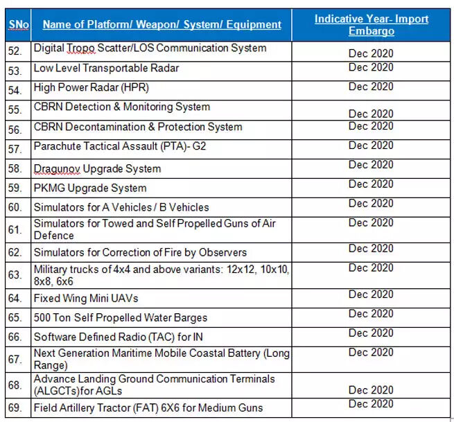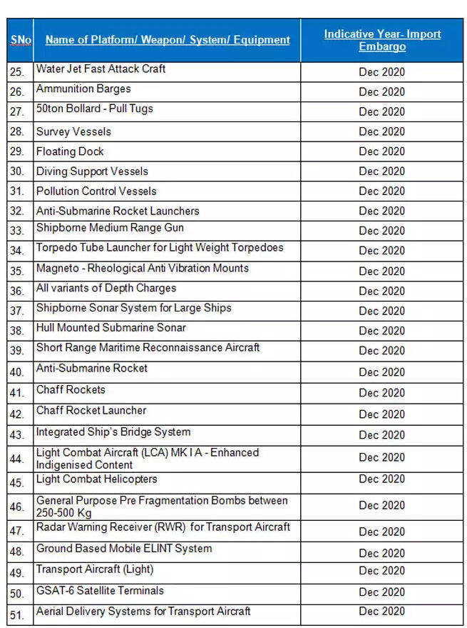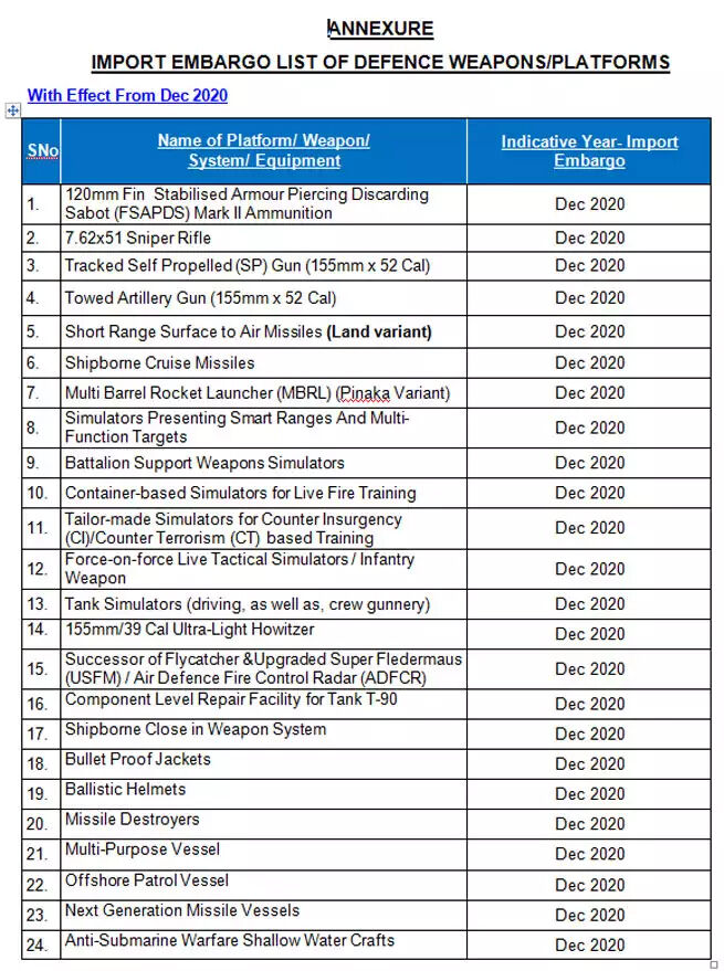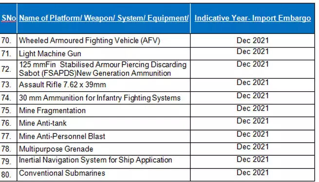 रक्षामंत्री ने बताया कि तीनों सेनाओं ने 260 योजनाओं के तहत इन सामानों का अप्रैल 2015 से अगस्त 2020 के बीच 3.5 लाख करोड़ रुपए का ठेका दिया। अनुमान है कि अगले 6-7 साल में घरेलू उद्योग को करीब 4 लाख करोड़ रुपए के ठेके मिलेंगे। रक्षा मंत्री ने बताया कि आयात पर प्रतिबंध के लिए चिह्नित सैन्य वस्तुओं के घरेलू स्तर पर उत्पादन की समयसीमा सुनिश्चित करने के लिए कदम उठाए जाएंगे। आयात पर प्रतिबंध के लिए और भी रक्षा उपकरणों को चरणबद्ध तरीके से चिह्नित किया जाएगा।
