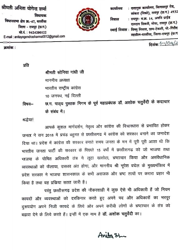 पत्र में अनिता शर्मा ने बताया है, उसके बाद चतुर्वेदी ने सरकार के खिलाफ उच्च न्यायालय में कई याचिकाएं डाली हैं। उन्होंने 2015 से 2019 के बीच पाठ्य पुस्तक निगम में हुई खरीदी, टेंडर प्रक्रिया, स्वेच्छानुदान आदि की जांच की मांग भी उठाई है। कांग्रेस विधायक ने लिखा है, भाजपा शासन में भ्रष्टाचार में डूबे अधिकारी को कांग्रेस शासनकाल में भी महत्वपूर्ण पद मिलना जनता के बीच चर्चा का केंद्र बना हुआ है। इससे प्रदेश की ही नहीं, सरकार और पंचायत एवं ग्रामीण विकास विभाग की छवि भी खराब हो रही है। इसका सीधा असर कांग्रेस और कांग्रेस सरकार की लोकप्रियता पर पड़ रहा है। विधायक ने लिखा है कि अशोक चतुर्वेदी को महत्वपूर्ण पद पर देखकर कांग्रेस के निष्ठावान जमीनी कार्यकर्ताओं के मन में वेदना है। इसका समाधान सिर्फ आपके माध्यम से ही हो सकता है।