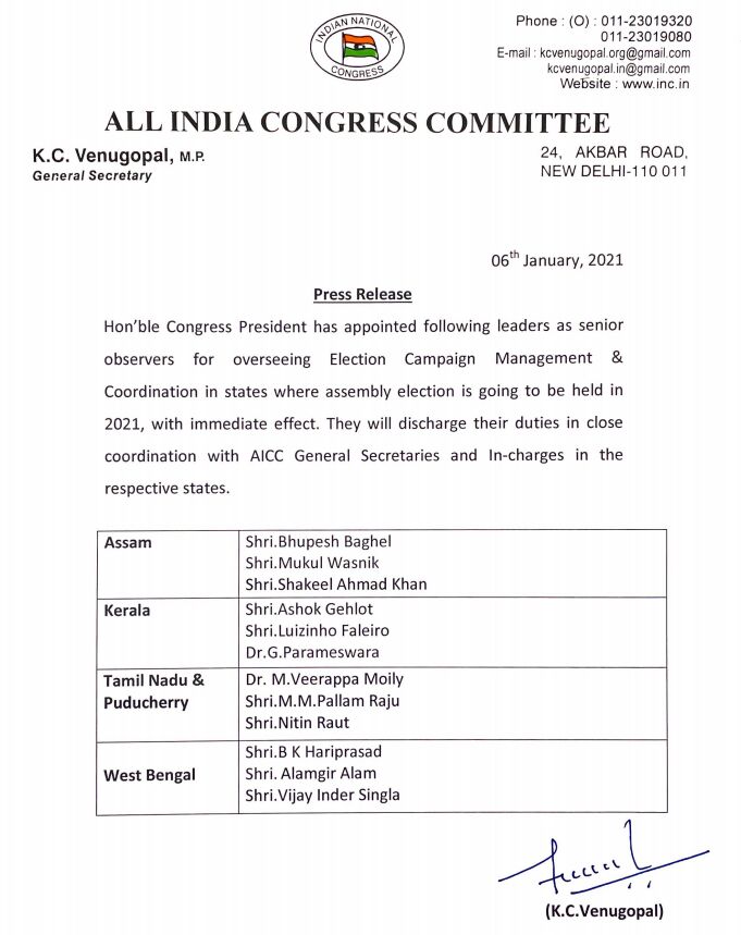 कांग्रेस द्वारा जारी बयान के अनुसार, राजस्थान के मुख्यमंत्री अशोक गहलोत, जी परमेश्वर, और लुईजिनो फ्लेरियो को केरल विधानसभा चुनाव की जिम्मेदारी सौंपी गई है।इसके आलावा छत्तीसगढ़ के मुख्यमंत्री भूपेश बघेल और वरिष्ठ नेता मुकुल वासनिक एवं शकील खान को असम विधानसभा का पर्यवेक्षक नियुक्त किया गया है। तमिलनाडु और पुडुचेरी विधानसभा चुनाव के लिए महाराष्ट्र सरकार के मंत्री नितिन राउत, कांग्रेस नेता एमएम पल्लम राजू और वीरप्पा मोइली को वरिष्ठ पर्यवेक्षक बनाया गया है। इसके अलावा पश्चिम बंगाल चुनाव के लिए पंजाब सरकार में मंत्री विजय इंदर सिंघला, झारखंड सरकार में मंत्री आलमगीर आलम एवं बीके हरि प्रसाद को पर्यवेक्षक बनाया गया है।