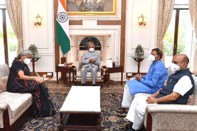 नईदिल्ली। केंद्रीय वित्त मंत्री निर्मला सीतारमण ने शुक्रवार को राष्ट्रपति रामनाथ कोविन्द से मुलाकात की। उन्होंने वित्त राज्य मंत्री डॉ भागवत किशनराव कराड और पंकज चौधरी के साथ राष्ट्रपति भवन में राष्ट्रपति कोविंद से मुलाकात की।