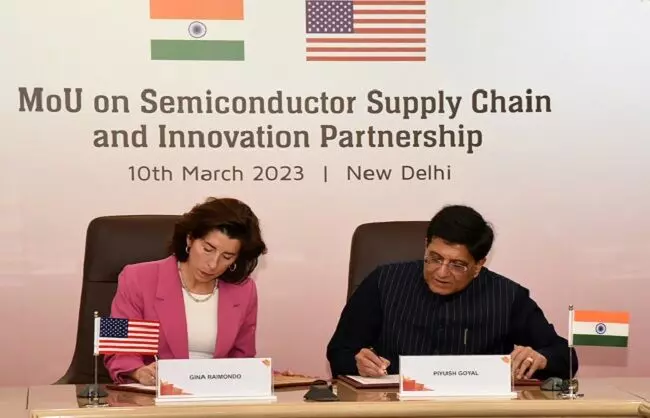 केंद्रीय वाणिज्य एवं उद्योग मंत्री पीयूष गोयल और अमेरिकी वाणिज्य मंत्री जीना रायमोंडो ने सेमीकंडक्टर आपूर्ति श्रृंखला स्थापित करने और नवाचार भागीदारी पर समझौता ज्ञापन पर हस्ताक्षर किए हैं। वाणिज्य एवं उद्योग मंत्रालय के मुताबिक भारत और अमेरिका ने सेमीकंडक्टर आपूर्ति श्रृंखला लचीलापन और विविधीकरण पर एक सहयोगी तंत्र स्थापित करने के लिए एक समझौता ज्ञापन (एमओयू) पर हस्ताक्षर किए हैं।मंत्रालय के मुताबिक पीयूष गोयल ने अमेरिकी वाणिज्य सचिव जीना रायमोंडो के साथ प्रतिनिधिमंडल स्तर की वार्ता भी की है। इससे पहले पीयूष गोयल ने अमेरिका की वाणिज्य सचिव जीना रायमोंडो से यहां मुलाकात की। मंत्रालय के मुताबिक सेमीकंडक्टर सप्लाई चेन और इनोवेशन पार्टनरशिप की स्थापना के लिए एक समझौता ज्ञापन भारत के ढांचे के तहत यूएस कमर्शियल डायलॉग पर नई दिल्ली में आयोजित कमर्शियल डायलॉग 2023 के बाद दोनों देशों के बीच ये हस्ताक्षर किए गए हैं।