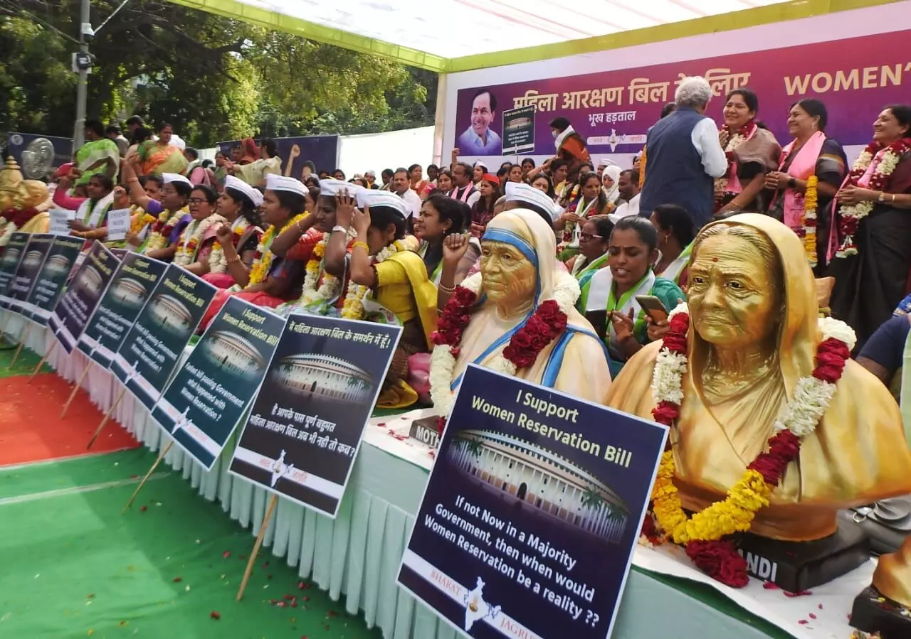 नईदिल्ली। तेलंगाना के मुख्यमंत्री के. चंद्रशेखर राव की बेटी और भारत राष्ट्र समिति दल की नेता के. कविता शुक्रवार को महिला आरक्षण बिल के समर्थन में दिल्ली के जंतर-मंतर पर भूख हड़ताल पर बैठीं।इस मौके पर के. कविता ने कहा कि महिला आरक्षण बिल महत्वपूर्ण है। इसे जल्द लाने की जरूरत है। जब तक यह विधेयक संसद में पेश नहीं किया जाता है, तबतक इसकी मांग नहीं रुकेगा। विधेयक राष्ट्र के विकास में सहायक होगा।