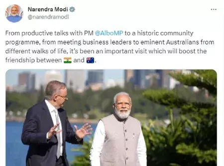 वहीँ प्रधानमंत्री नरेंद्र मोदी ने ट्वीट कर लिखा, "प्रधानमंत्री एंथनी अल्बनीज के साथ आज की बातचीत व्यापक रही. पिछले एक साल में यह हमारी छठी मुलाकात है, जो भारत-ऑस्ट्रेलिया की अच्छी दोस्ती के संकेत है. अगर क्रिकेट की शब्दावली में कहा जाए- हम मजबूती से टी-20 मोड में हैं."मैं ऑस्ट्रेलिया के लोगों, ऑस्ट्रेलियाई सरकार और मेरे प्रिय मित्र को धन्यवाद देता हूं अल्बनीज उनके आतिथ्य के लिए। हम एक जीवंत भारत-ऑस्ट्रेलिया दोस्ती की दिशा में काम करते रहेंगे, जो वैश्विक भलाई के हित में भी है।