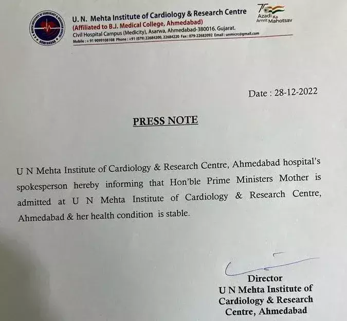 अहमदाबाद। प्रधानमंत्री नरेंद्र मोदी की माँ हीराबेन की तबियत बिगड़ने के बाद उन्हें अस्पताल में भर्ती कराया गया है। प्रधानमंत्री नरेन्द्र मोदी बुधवार को तीसरे पहर अपनी बीमार मां को देखने अहमदाबाद पहुंचे। उनकी मां हीराबा यूएन मेहता अस्पताल में भर्ती हैं।हीराबा की तबीयत अचानक बिगड़ने पर मंगलवार देर रात उन्हें अहमदाबाद के शाहीबाग स्थित यूएन मेहता अस्पताल में भर्ती कराया गया। अस्पताल प्रशासन की ओर से जारी हेल्थ बुलेटिन में उनकी हालत स्थिर बताई गई है। अस्पताल में विशेषज्ञ चिकित्सकों की देखरेख में उनका इलाज चल रहा है। प्रधानमंत्री के आगमन के मद्देनजर सुरक्षा व्यवस्था कड़ी कर दी गई है।