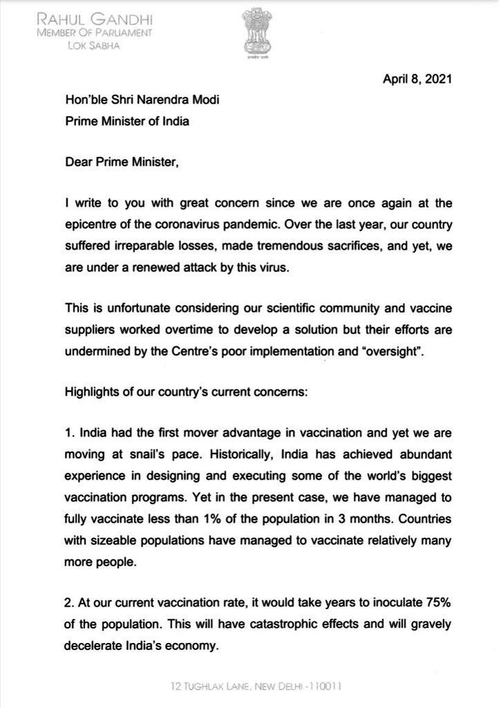 वहीं देश में चल रहे टीकाकरण अभियान की गति को लेकर भी राहुल गांधी ने सरकार पर हमला बोला। उन्होंने कहा कि टीकाकरण की प्रक्रिया शुरू करने में तो भारत ने बढ़त बना ली लेकिन यह प्रक्रिया बहुत धीमी गति से चल रही है। आलम यह है कि तीन महीने में अभी तक कुल आबादी के एक प्रतिशत से भी कम लोगों को टीका लग सका है।