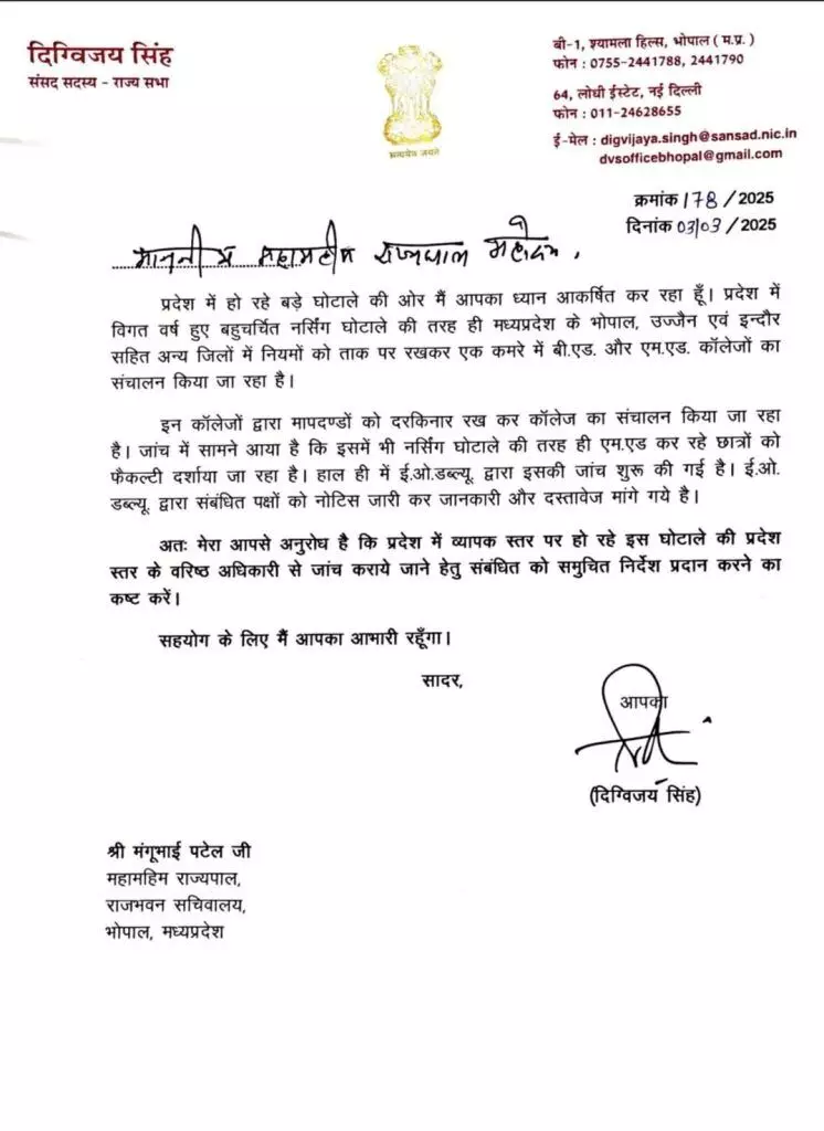 दिग्विजय सिंह ने उठाया बीएड-एमएड कॉलेजों में चल रहे घोटाले का मुद्दा, राज्यपाल से कार्रवाई की मांग