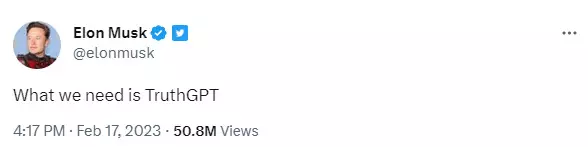 एलन मस्क ने एक इंटरव्यू में इसका खुलासा किया। उन्होंने कहा कि चैटबॉट इस चैटजीपीटी को पीछे से झूठ बोलने का प्रशिक्षण दे रहा है। कंपनी का उद्देश्य इससे जनता की भलाई नहीं बल्कि पैसा कमाना है। उन्होंने कहा कि मानवता को बचाने के लिए एक अलग एआई प्रोडक्ट की जरूरत है। वह नया एआई चैटबॉट लाकर मस्क चैटजीपीटी को बड़ी चुनौती देना चाहेंगे।