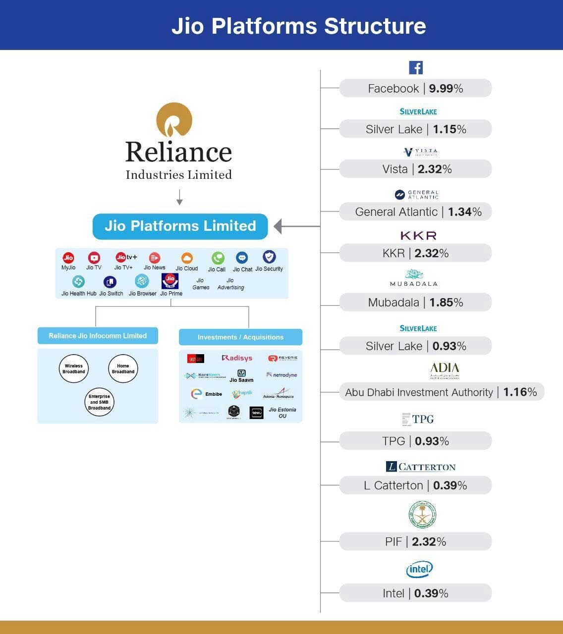 जियो प्लेटफॉर्म्स में निवेश 22 अप्रैल को फेसबुक से शुरू हुआ था, उसके बाद सिल्वर लेक, विस्टा इक्विटी, जनरल अटलांटिक, केकेआर, मुबाडला और सिल्वर लेक ने अतिरिक्त निवेश किया था। बाद में अबू धाबी इन्वेस्टमेंट अथॉरिटी ( ADIA), TPG, एल कैटरटन और PIF ने भी निवेश की घोषणा की थी।