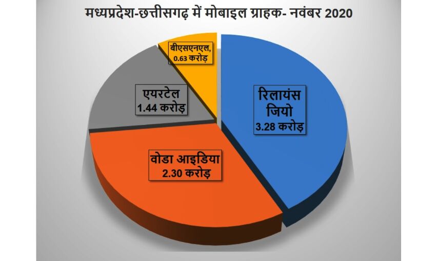 ट्राई की रिपोर्ट अनुसार मध्यप्रदेश-छत्तीसगढ़ में रिलायंस जियो ने नवंबर 2020 में 4.16 लाख नए ग्राहक जोड़े हैं। अब जियो के 3.28 करोड़ ग्राहक हैं। मध्यप्रदेश में जियो पहले स्थान पर रहने के पीछे कंपनी के बेहतरीन 4जी नेटवर्क की पूरे सर्किल में पहुंच और किफायती प्लान प्रमुख कारण है। वहीँ भारती एयरटेल के ग्राहक 2.58 लाख बढ़कर 1.44 करोड़ हो गए हैं। वोडाफोन आइडिया के ग्राहकों की संख्या 66706 बढ़कर 2.3 करोड़ हो गई है। सरकारी कंपनी बीएसएनएल के ग्राहकों की संख्या 14454 बढ़कर 63.1 लाख हो गई।