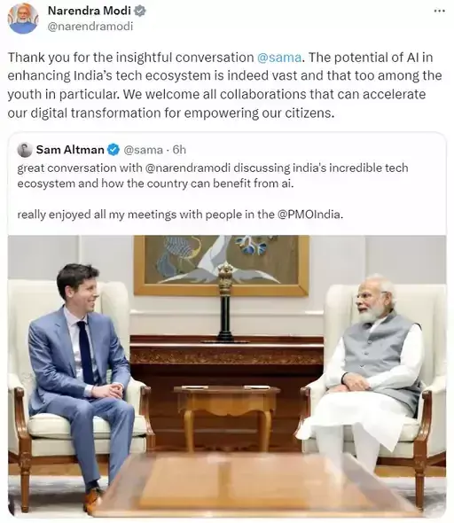 इससे पहले, ऑल्टमैन ने एक ट्वीट में कहा, “प्रधानमंत्री नरेन्द्र मोदी के साथ शानदार बातचीत रही। भारत के अविश्वसनीय तकनीकी पारिस्थितिकी तंत्र और एआई से देश को कैसे लाभ हो सकता है, इस पर चर्चा की। प्रधानमंत्री कार्यालय में सभी लोगों के साथ मुलाकात आनंदमय रही।”ऑल्टमैन ने बताया कि मैंने प्रधानमंत्री से पूछा कि भारत ने चैट्जीपीटी को इतनी जल्दी और इतना ज्यादा क्यों अपना लिया। प्रधानमंत्री के पास इसके बारे में शानदार जवाब थे। ऑल्टमैन ने कहा कि हमने भारत में AI के अवसरों और उसके रेगुलेशन के बारे में भी बात की।प्रधानमंत्री और चैट्जीपीटी बनाने वाले सैम ऑल्टमैन के बीच यह मीटिंग ऐसे समय हुई है, जब भारत सरकार AI बेस्ड चैटबॉट को रेगुलेट करना चाहती है।
