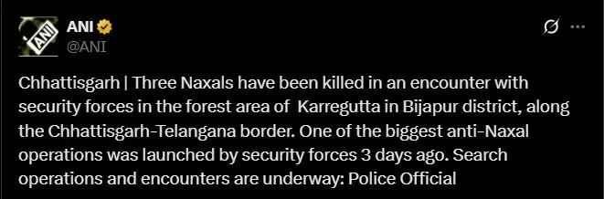 पुलिस अधिकारी ने जानकारी देते हुए बताया कि, छत्तीसगढ़-तेलंगाना सीमा पर बीजापुर जिले के कर्रेगुट्टा के जंगल में सुरक्षा बलों के साथ मुठभेड़ में तीन नक्सली मारे गए हैं। सुरक्षा बलों ने 3 दिन पहले सबसे बड़े नक्सल विरोधी अभियानों में से एक शुरू किया था। तलाशी अभियान और मुठभेड़ जारी है।