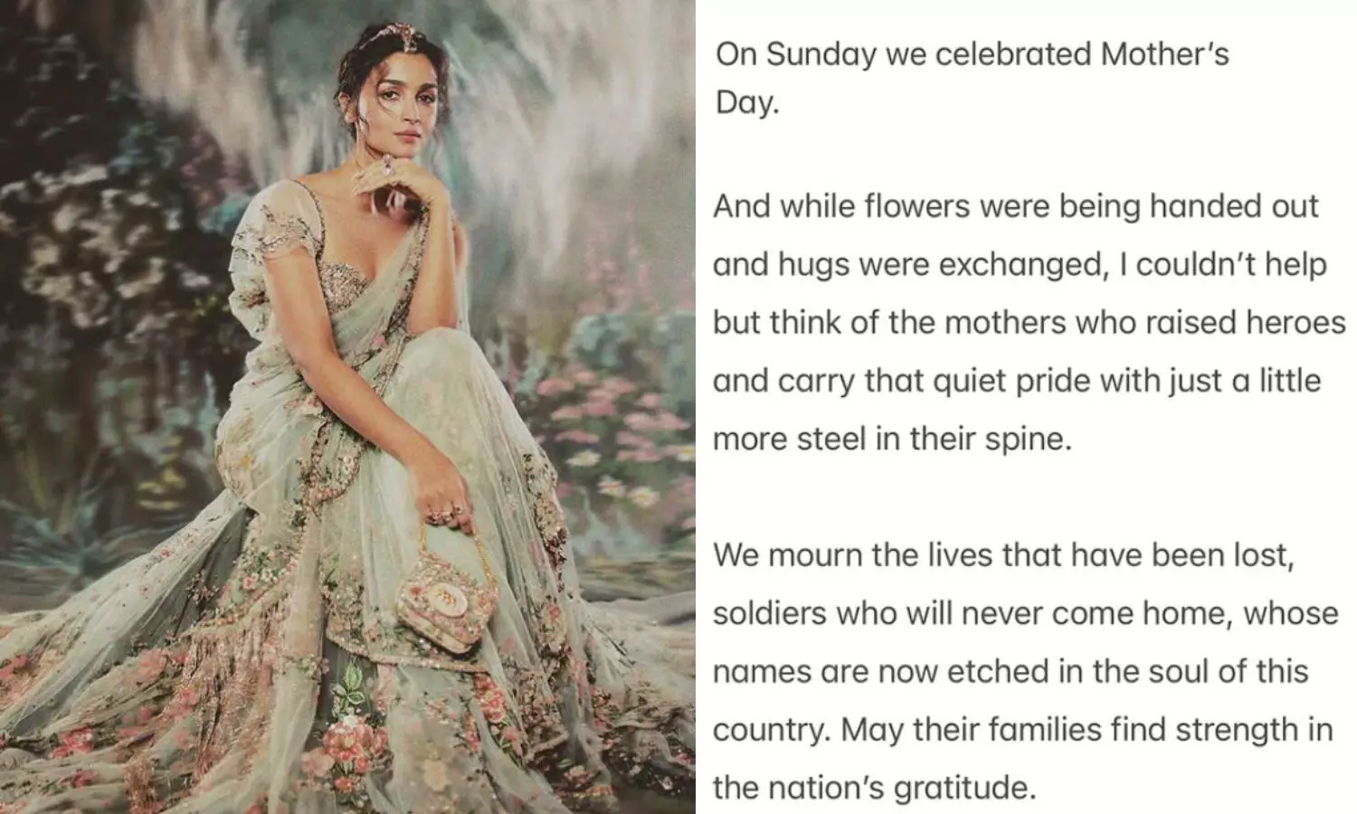 मदर्स डे के मौके पर पोस्ट की गई इस लंबी और इमोशनल पोस्ट में आलिया ने हाल ही में हुए ऑपरेशन सिंदूर और जवानों के बलिदान की बात की। उन्होंने लिखा कि बीते कुछ दिन जैसे वक्त ठहर गया हो, हर न्यूज़ नोटिफिकेशन, हर खाने की टेबल पर एक ही चर्चा कि कहीं दूर हमारे सैनिक जाग रहे हैं, पहाड़ों में, मुश्किलों के बीच, हमारी नींद की हिफाज़त करते हुए।