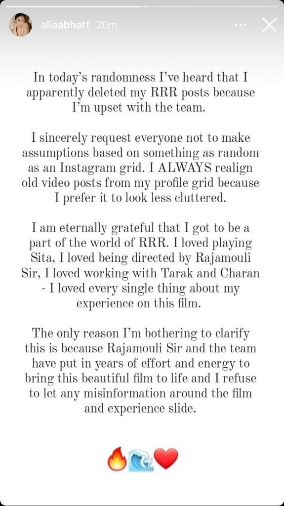 अब इस पूरे मामले में आलिया भट्ट ने अपनी चुप्पी तोड़ी है। आलिया भट्ट ने अपनी इंस्टा स्टोरी पर पोस्ट शेयर कर लिखा-'अचानक आज कहीं सुना कि मैंने आरआरआर से जुड़े पोस्ट इसलिए डिलीट कर दिए क्योंकि मैं फिल्म की टीम से नाराज हूँ। मैं उन सभी से प्रार्थना करती हूँ कि धारणा के आधार पर कोई खबर न बनाएं। मैं हमेशा ही पुराने वीडियो पोस्ट को अपने प्रोफाइल ग्रिड पर व्यवस्थित करती रहती हूँ क्योंकि मैं इसे कम अव्यवस्थित दिखाना पसंद करती हूँ। मैं आआरआर का हिस्सा बनकर बेहद खुश हूँ। सीता का रोल निभाना मुझे अच्छा लगा। राजामौली सर के साथ काम करना अच्छा लगा। मैंने फिल्म का हर एक मिनट एन्जॉय किया। तारक और चरण के साथ काम करके मजा आया। इस खबर की सच्चाई मैं इसलिए बता रही हूँ क्योंकि राजामौली सर और फिल्म की टीम ने इसे बनाने में बहुत मेहनत की है। मैं नहीं चाहती कि फिल्म से जुड़ी किसी भी तरह की अफवाह फैलाई जाए।'
