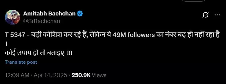 अमिताभ बच्चन को हिंदी सिनेमा का शहंशाह कहा जाता है। उन्होंने अपने करियर में कई ब्लॉकबस्टर फिल्में दी हैं और आज भी अपनी सक्रियता से प्रशंसकों का दिल जीतते हैं। उनका यह ट्वीट न केवल उनके ह्यूमर को दर्शाता है, बल्कि सोशल मीडिया पर उनकी लोकप्रियता भी दिखाता है। 49 मिलियन फॉलोअर्स की संख्या पहले से ही किसी भी भारतीय सेलिब्रिटी के लिए एक बड़ी उपलब्धि है, फिर भी महानायक का यह प्रयास दिखाता है कि वे अपने फैंस के साथ जुड़े रहने के लिए हर संभव कोशिश करना चाहते हैं।