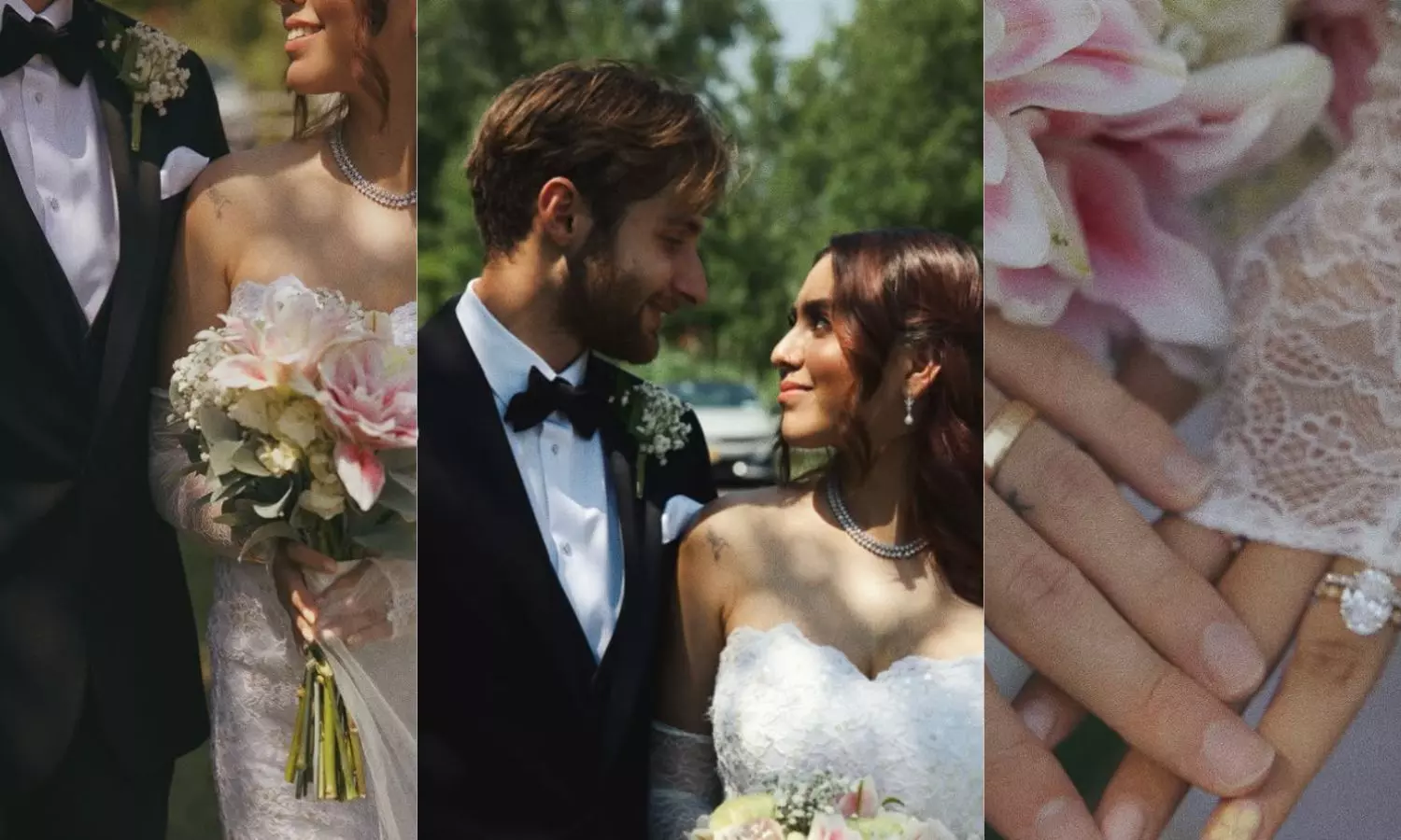तस्वीरों में आलिया व्हाइट ऑफ-शोल्डर गाउन, लेस ग्लव्स और वेइल में नजर आई, जबकि शेन ने ब्लैक टक्सीडो और बो टाई पहनी थी। दोनों की रोमांटिक तस्वीरें गार्डन में क्लिक की गई, जिनमें उनकी खुशी और प्यार साफ झलक रहा है।