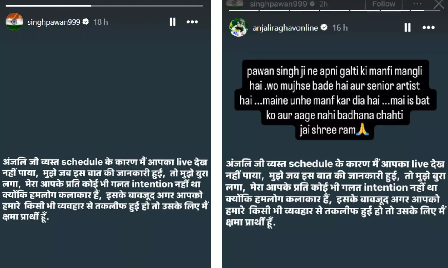 इसके बाद पवन सिंह ने अंजलि से माफी मांगते हुए कहा –"अंजलि जी, बिजी शेड्यूल की वजह से मैं आपका लाइव नहीं देख पाया। मुझे जब इस बात की जानकारी हुई तो बुरा लगा। मेरा आपके प्रति कोई गलत इरादा नहीं था। अगर मेरे किसी व्यवहार से आपको ठेस पहुंची है तो मैं क्षमा चाहता हूं।"