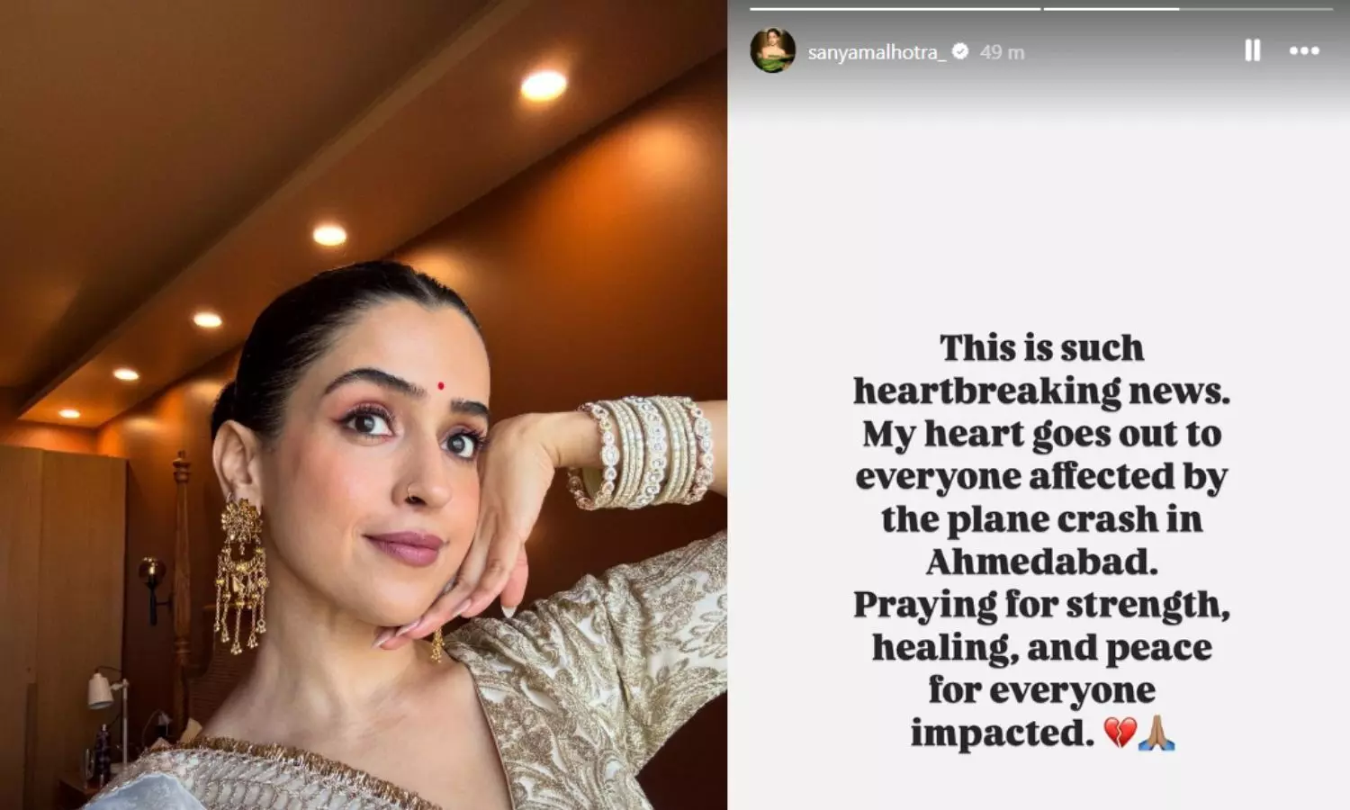 सान्या मल्होत्रा ने इंस्टाग्राम पर लिखा,"यह बेहद दिल तोड़ देने वाली खबर है। मेरा दिल उन सभी लोगों के साथ है जो इस हादसे से प्रभावित हुए हैं। सभी को शक्ति, शांति और जल्दी से ठीक होने की दुआ देती हूं।"