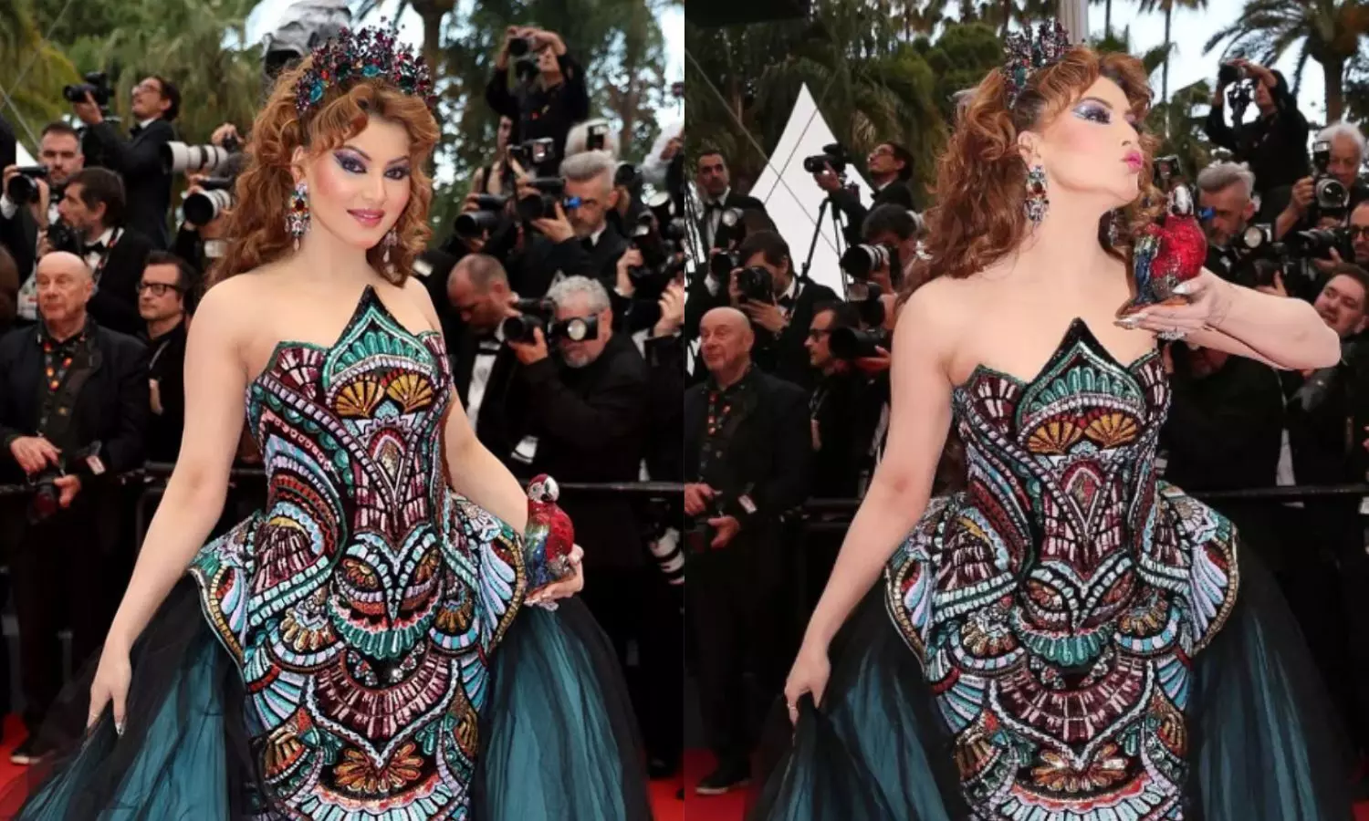 उर्वशी इस बार रेड कार्पेट पर एक बेहद कलरफुल और ड्रामेटिक गाउन में नजर आई, जिसमें लाल, नीला और पीला रंग प्रमुखता से दिखा। इस लुक को उन्होंने एक झिलमिलाता हुआ पैरट (तोता) शेप क्लच और एक खूबसूरत टियारा पहनकर पूरा किया।