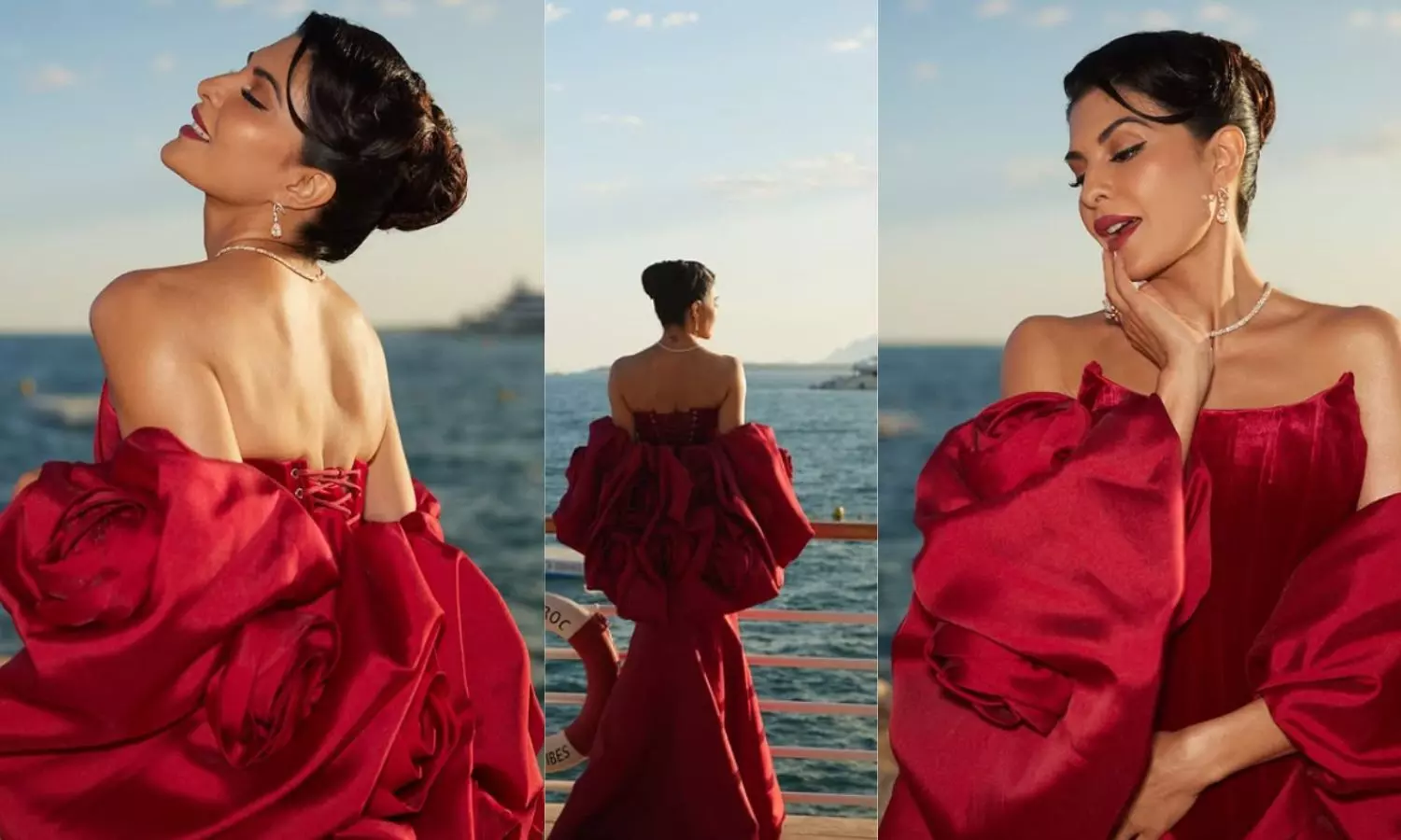 जैकलीन फर्नाडिस ने कान्स में यू-नेकलाइन और फिशटेल स्कर्ट वाले रेड गाउन में सबका ध्यान खींचा। उन्होंने इस लुक को डायमंड जूलरी, एमेरल्ड-कट पेंडेंट, टियर-ड्रॉप इयररिंग्स और क्लासिक हेयरस्टाइल के साथ पूरा किया, जो उन्हें ओल्ड हॉलीवुड ग्लैमर लुक दे रहा था।