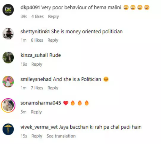 एक सेलिब्रिटी फोटोग्राफर द्वारा इंस्टाग्राम पर पोस्ट किए गए वीडियो में, हेमा मालिनी एक कार्यक्रम में अनूप जलोटा और कई अन्य लोगों के साथ देखी जा सकती हैं। हालांकि, जैसे ही एक महिला उनके साथ पोज देने की कोशिश करती है, अभिनेत्री असहज दिखाई देती हैं। वीडियो में वह महिला को एक तरफ हटने का इशारा करते हुए कहती हैं, "हाथ नहीं.. नेटिज़न्स ने महिला के प्रति इतने विनम्र व्यवहार नहीं करने के लिए अभिनेत्री-राजनेता की आलोचना की है। एक यूजर ने कमेंट किया, "सारी जिंदगी इंसान के साथ काम किया अब बुढ़ापे में औरत का हाथ टच होने पर एतरज़ दिखा रही।