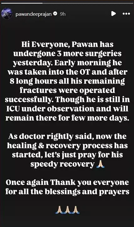 |पवनदीप की टीम ने आज इंस्टाग्राम के माध्यम से हेल्थ अपड़ेट जारी कि, जिसमें बताया गया कि पवनदीप की आठ घंटे में तीन सर्जरी हुई है, जिसके बाद अभी वे आईसीयू में भर्ती है