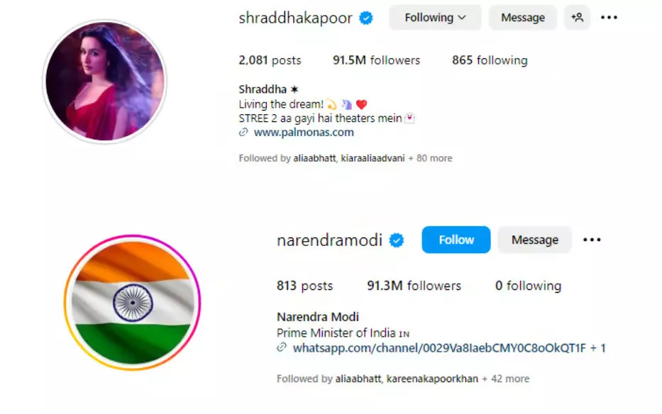 विराट कोहली के बाद, जिनके इंस्टाग्राम पर 271 मिलियन फॉलोअर्स हैं, प्रियंका चोपड़ा 91.8 मिलियन फॉलोअर्स के साथ दूसरे सबसे ज़्यादा फॉलो किए जाने वाले भारतीय हैं। आलिया भट्ट के इस प्लेटफॉर्म पर 85.1 मिलियन फॉलोअर्स हैं और मां बनने वाली दीपिका पादुकोण के 79.8 मिलियन फॉलोअर्स हैं। हालांकि, पीएम मोदी 101.2 मिलियन फॉलोअर्स के साथ एक्स (ट्विटर) पर सबसे ज़्यादा फॉलो किए जाने वाले वैश्विक नेताओं में से एक हैं।