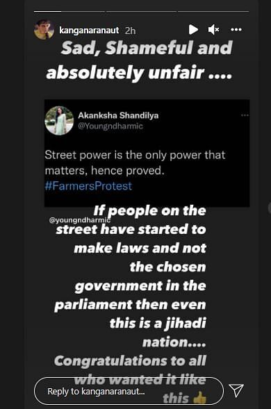 |नईदिल्ली। इन दिनों विवादों में चल रही फिल्म अभिनेत्री कंगना रनौत ने कृषि कानून को वापस लेने के सरकार के फैसले को शर्मनाक बताया है कंगना ने अपनी इंस्टा स्टोरी पर पोस्ट साझा करते हुए लिखा-' 'दुखद, शर्मनाक और सरासर गलत... अगर संसद में बैठी सरकार के बजाय गलियों में बैठे लोग कानून बनाना शुरू कर देंगे तो यह भी एक जिहादी देश बन जाएगा... उन सभी को बधाई जो ऐसा चाहते हैं।'