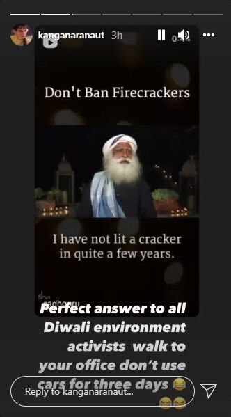 |मुंबई। अपने बेबाक बयानों के कारण चर्चा में रहने वाली अभिनेत्री कंगना रनौत एक बार फिर से सुर्ख़ियों में हैं।इस बार कंगना रनौत ने दीपावली पर पटाखों के बैन होने पर अपनी प्रतिक्रिया दी है। कंगना ने भी पटाखे ना जलाने की बात पर असहमति जताई है। उन्होंने सदगुरु का वीडियो अपनी इंस्टा स्टोरी पर साझा किया है।