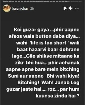 दरअसल, करण जौहर न बुधवार को अपनी इंस्टा स्टोरी पर एक पोस्ट शेयर किया है, जिसमें लिखा है -'कोई गुज़र गया। फिर आपने अफ़सोस वाला बटन दबा दिया। वही लाइफ़ इज़ शॉर्ट (ज़िंदगी छोटी है) वाली बात हज़ारवीं बार दोहराने लगे। गिल-शिकवे मिटाने का ज़िक्र भी हुआ।फिर आपने अचानक अपने बारे में बिचिंग (बुराई) सुनी और आपने भी वही किया। बिचिंग। वाह! जनाब लोग गुज़र जाते हैं... रोज़... पर हम कौन-सा ज़िंदा हैं?'