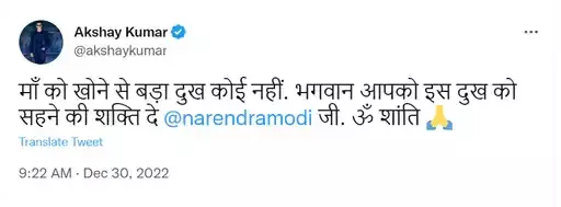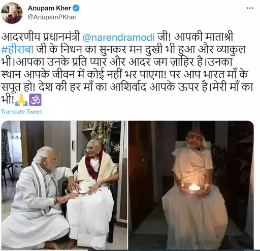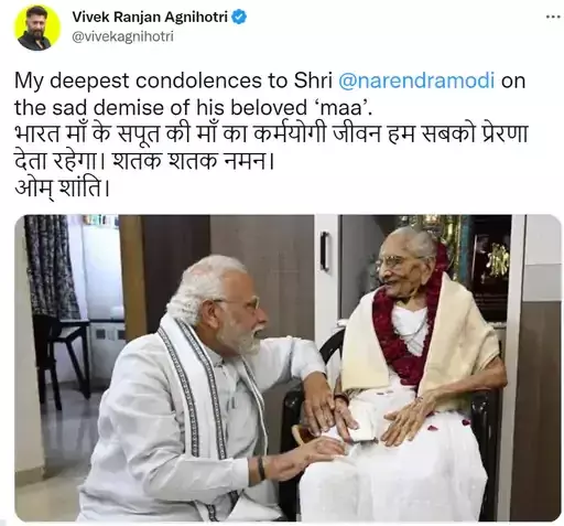 फिल्ममेकर श्री नरेंद्रमोदी को उनकी प्यारी 'मां' के दुखद निधन पर मेरी गहरी संवेदना। भारत मां के सपूत की मां का कर्मयोगी जीवन हम सबको प्रेरणा देता रहेगा। ओम शांति।'