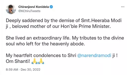साउथ सुपरस्टार चिरंजीवी ने लिखा- 'हमारे माननीय प्रधान मंत्री की प्यारी मां श्रीमती हीराबा मोदी जी के निधन से गहरा दुख हुआ। वह एक असाधारण जीवन जीती थीं। स्वर्गलोक को प्रस्थान करने वाली दिव्य आत्मा को मेरी श्रद्धांजलि। ओम शांति।'