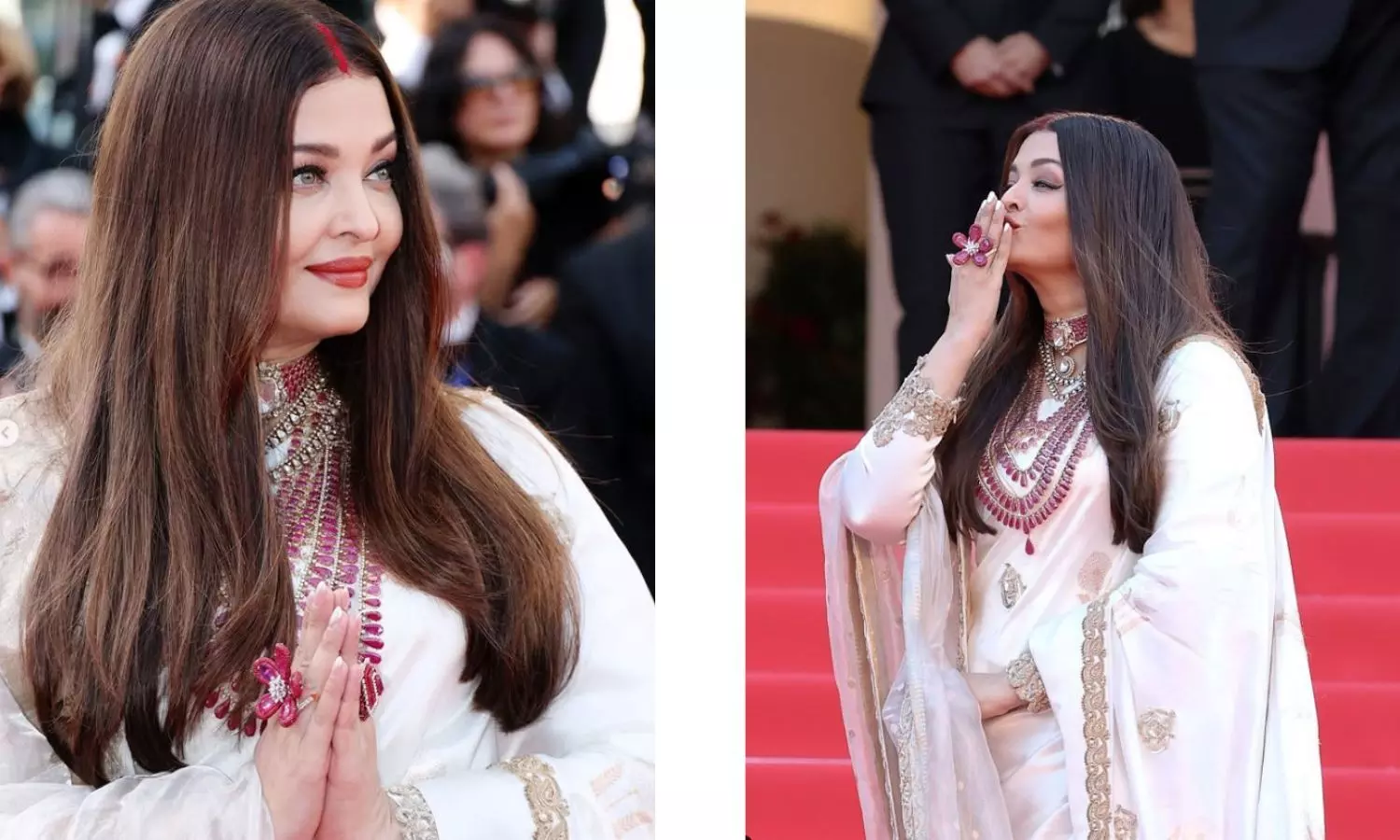 सबसे खास बात यह रही कि ऐश्वर्या ने मिडल पार्टिशन हेयरस्टाइल के साथ मांग में सिंदूर भी लगाया है। शाही लुक के साथ ऐश्वर्या ने रेड कार्पेट पर नमस्ते किया, जिसने सभी को भारतीय संस्कृति की याद दिला दी।