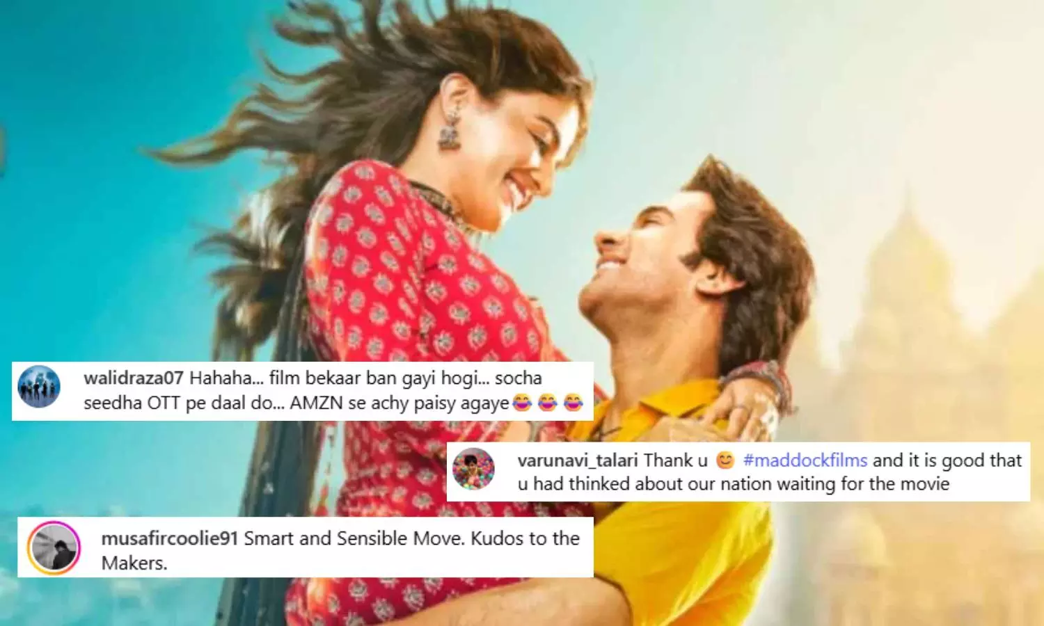 मैडॉक फिल्म्स ने सोशल मीडिया प्लेटफार्म पर पोस्ट साझा कर लिखा कि - “हाल ही में हुई घटनाओं और देशभर में बढ़ती सुरक्षा को देखते हुए, मैडॉक फिल्म्स ने अमेजन एमजीएम स्टूडियोज के साथ मिलकर ये फैसला किया है कि हमारी फैमिली एंटरटेनर फिल्म 'भूल चूक माफ' अब सीधे आपके घरों में आएगी। यह फिल्म अब सिनेमाघरों पर नहीं बल्कि 16 मई को प्राइम वीडियो पर रिलीज होगी। हमारी पूरी टीम इस फिल्म को आप सभी के साथ सिनेमाघरों देखना चाहती थी, लेकिन देश की भावना और सुरक्षा सबसे पहले है। जय हिंद।"