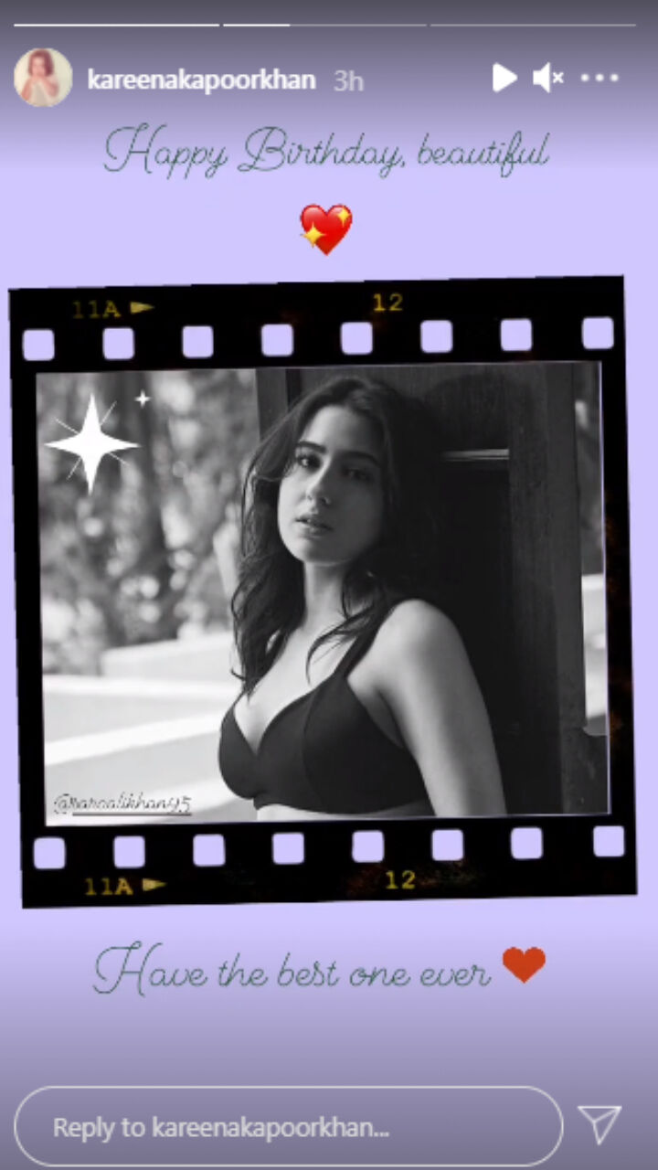 इस खास मौके पर सारा अली खान की स्टेप मदर एवं सैफ अली खान की दूसरी पत्नी करीना कपूर खान ने सारा को खास अंदाज में जन्मदिन की बधाई दी है। करीना कपूर खान ने अपनी इंस्टाग्राम स्टोरी पर सारा की एक ख़ूबसूरत तस्वीर को साझा करते हुए उन्हें जन्मदिन की बधाई दी है।