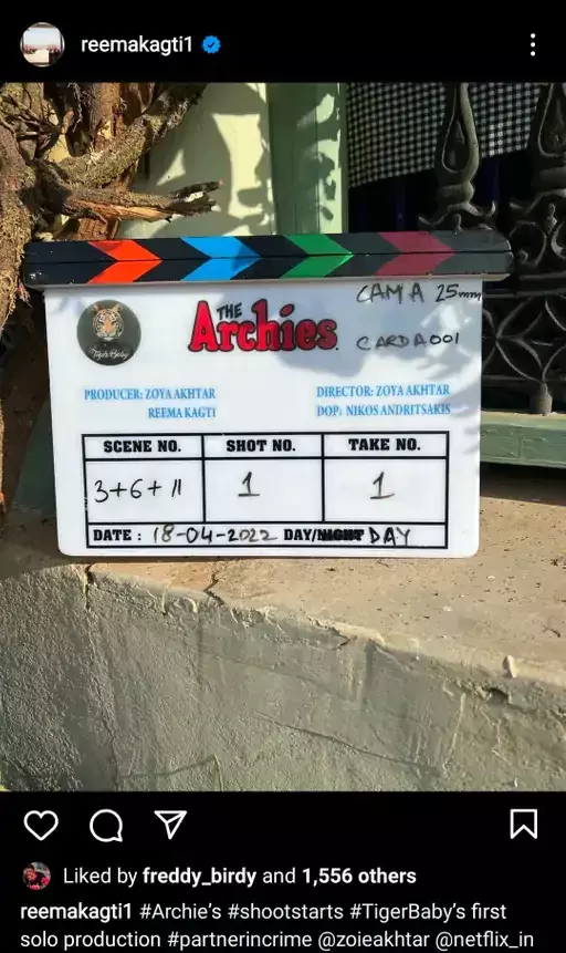 रीमा ने अपने इंस्टाग्राम पर द आर्चीज के पहले शॉट की डीटेल्स देते हुए एक क्लैपबोर्ड की फोटो शेयर की। रीमा ने इस पोस्ट पर कैप्शन लिखा, #आर्चीज, #शूटस्टार्ट्स #टाइगरबेबी का पहला सोलो प्रोड्क्शन।"उन्होंने जोया अख्तर को टैग करते हुए पार्टनर इन क्राइम बताया। इस फिल्म को जोया और रीमा साथ में मिलकर प्रोड्यूस कर रही हैं।
