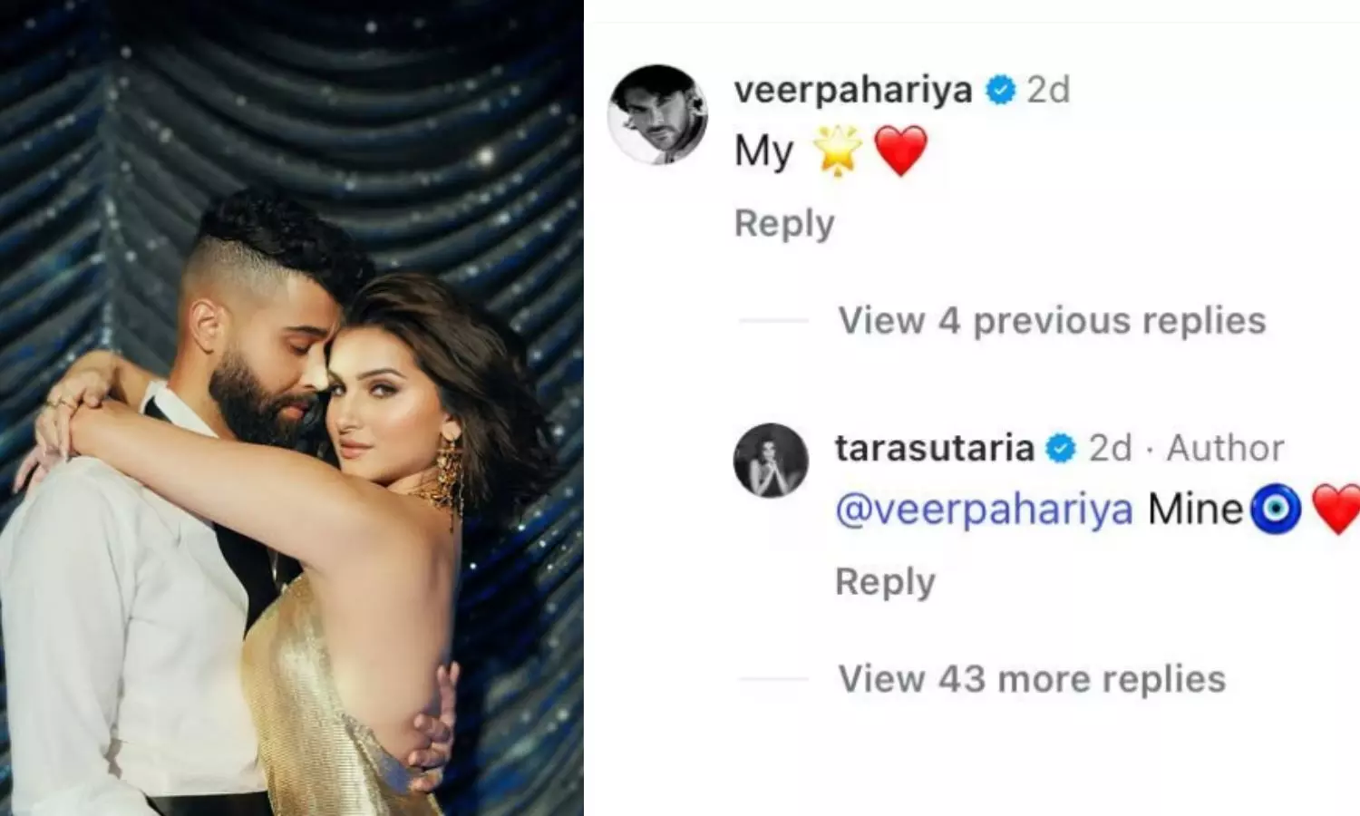 हाल ही में तारा सुतारिया ने अपने नए म्यूजिक वीडियो ‘थोड़ी सी दारू’ की कुछ तस्वीरें इंस्टाग्राम पर शेयर की, जिसमें वह सिंगर एपी ढिल्लों के साथ नजर आ रही है। यह गाना हाल ही में रिलीज हुआ है और दर्शकों को काफी पसंद भी आ रहा है। इसी पोस्ट पर वीर पहाड़िया ने कमेंट किया ‘माय लव’ जिस पर तारा ने भी तुरंत प्यार भरा जवाब देते हुए लिखा “माइन”।