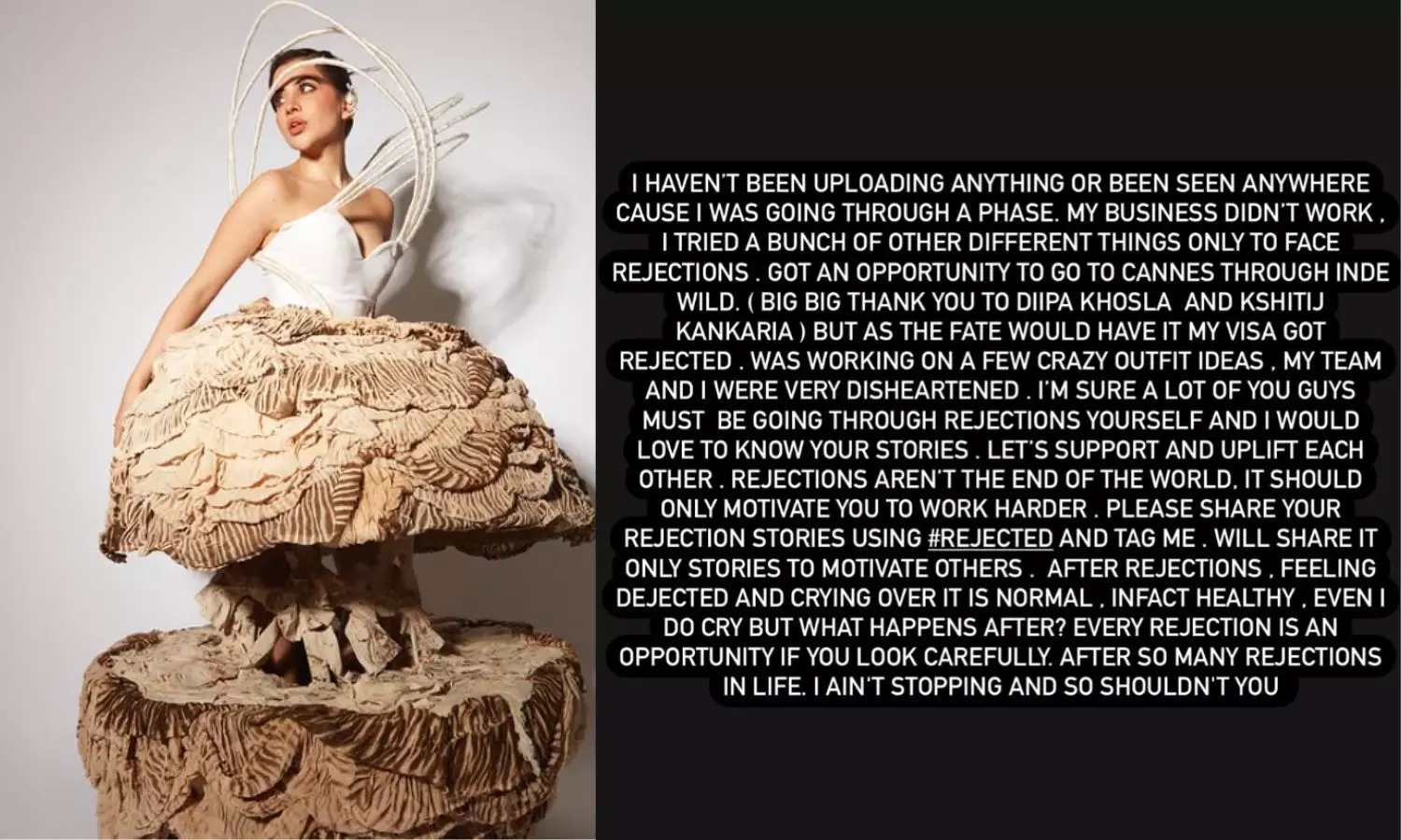 उर्फी ने कान्स न जाने की वजह बताते हुए लिखा, "मुझे इंडे वाइल्ड के जरिए कान्स जाने का मौका मिला था, लेकिन जैसा मेरी किस्मत में था, मेरा वीजा रिजेक्ट हो गया। मैं कुछ मजेदार और अलग आउटफिट आइडियाज पर काम कर रही थी, लेकिन वीजा रिजेक्शन के बाद मैं और मेरी टीम बहुत ज्यादा निराश हो गए है।"