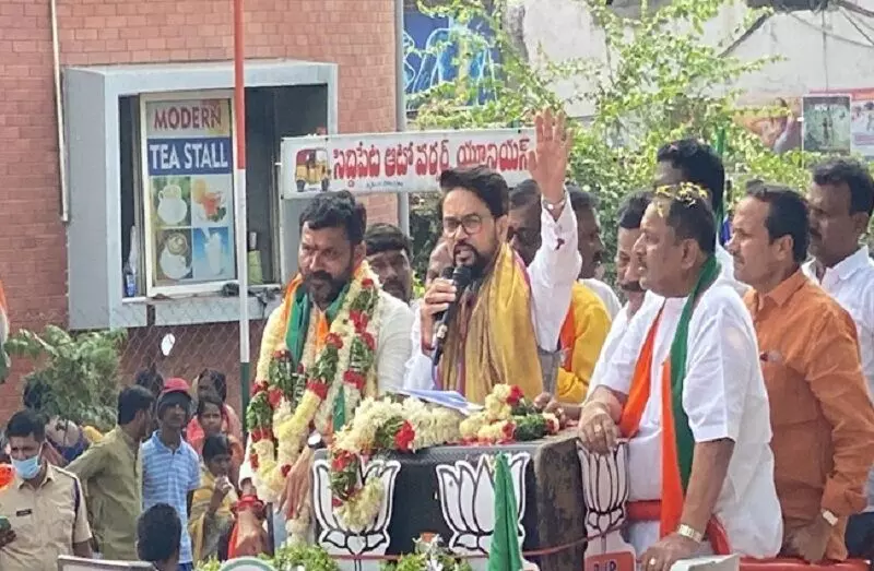 |केंद्रीय सूचना एवं प्रसारण अनुराग सिंह ठाकुर ने सोमवार को सिद्दीपेट विधानसभा क्षेत्र से भाजपा प्रत्याशी डी श्रीकांत रेड्डी के पक्ष में रोड शो कर एक विशाल जनसमूह को संबोधित किया।द । अपने संबोधन में अनुराग ठाकुर ने तेलंगाना के मुख्यमंत्री के. चन्द्रशेखर राव (केसीआर) और उनके परिवार को भ्रष्टाचारी बताते हुए कहा कि इनके हाथ तेलंगाना के कालेश्वरम प्रोजेक्ट से लेकर दिल्ली के शराब घोटाले तक संलिप्त हैं। अनुराग ठाकुर ने कहा, "केसीआर और उनके परिवार ने तेलंगाना को सिर्फ और सिर्फ लूटने का काम किया है। दिल्ली के आम आदमी पार्टी के भ्रष्ट नेताओं की तरह जल्द ही तेलंगाना के भ्रष्टाचारियों को भी जेल में डाला जाएगा।"