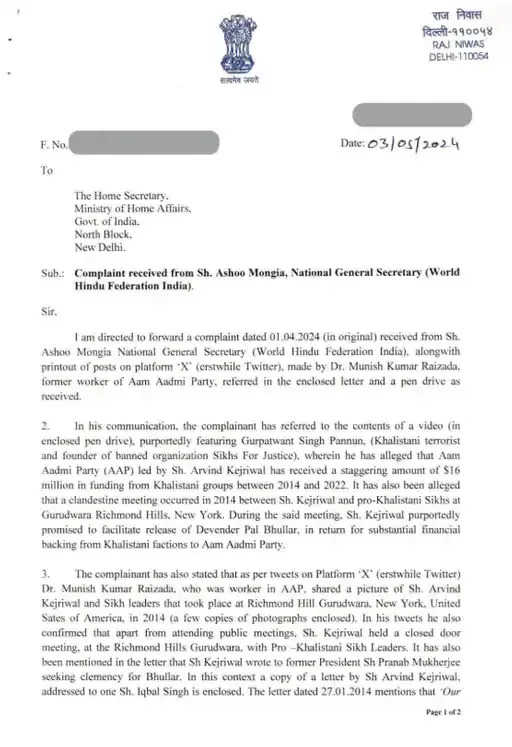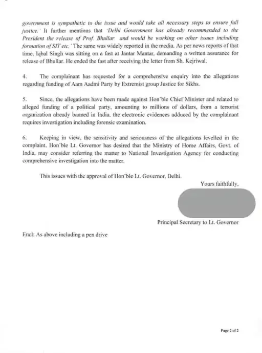 जानकारी के अनुसार, उपराज्यपाल के वर्ल्ड हिंदू फेडरेशन के राष्ट्रीय महासचिव आशू मोंगिया की शिकायत आई थी, जिसमें कहा गया था कि अरविंद केजरीवाल की पार्टी ने 2014 से 2002 के बीच आतंकी संगठन सिख फॉर जस्टिस से 33 करोड़ रुपए लिए है। जिसके बदले में आतंकी देवेंद्र पाल भुल्लर की रिहाई का वादा किया है। इसी शिकायत के आधार पर उपराज्यपाल ने जांच की सिफारिश की है।