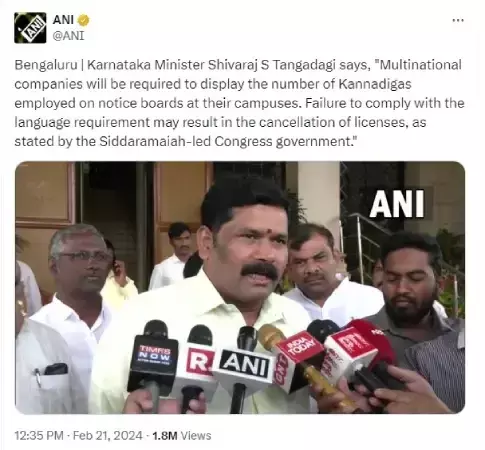 सिद्धारमैया के नेतृत्व वाली कांग्रेस सरकार ने हाल ही में गुरुवार (15 फरवरी) को एक नया नियम पारित किया है। कन्नड़ भाषा व्यापक विकास अधिनियम 2022 अनुसार प्राइवेट, बहुराष्ट्रीय कंपनियों, वाणिज्यिक,औद्योगिक, व्यावसायिक उपक्रमों, अस्पतालों, परामर्श केंद्रों, ट्रस्टों, मनोरंजन केंद्रों, प्रयोगशालाओं और होटलों सहित कई प्रकार के प्रतिष्ठानों में साइनबोर्ड पर 60 फीसदी कन्नड़ कर्मचारी की संख्या प्रदर्शित करना अनिवार्य हैं। अनुपालन न करने पर उनका बिजनेस लाइसेंस रद्द कर दिया जाएगा।