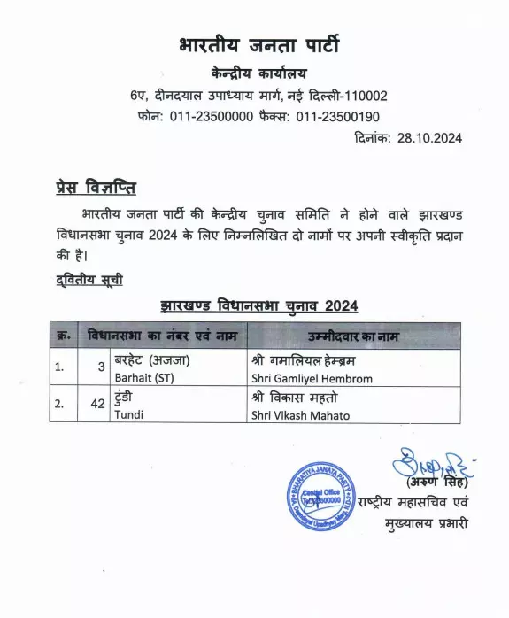 BJP Candidate List: बीजेपी ने जारी की झारखंड विधानसभा चुनाव के लिए दूसरी सूची, टुंडी से विकास महतो उम्मीदवार