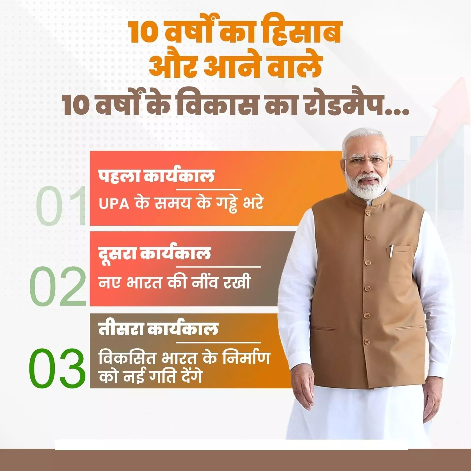 नईदिल्ली। भारतीय जनता पार्टी (भाजपा) ने इस साल होने वाले लोकसभा चुनाव से पहले मोदी सरकार के दोनों कार्यकाल की दो अहम उपलब्धियां और आने वाले तीसरे कार्यकाल की प्रमुख प्राथमिकता देश के सामने रखी है। भाजपा ने अपने एक्स हैंडल पर प्रधानमंत्री नरेन्द्र मोदी के फोटो के साथ लिखा है-''मोदी सरकार के 10 वर्षों का हिसाब और आने वाले 10 वर्षों के विकास का रोडमैप। हमारा तीसरा कार्यकाल बहुत बड़े फैसलों का होगा।''