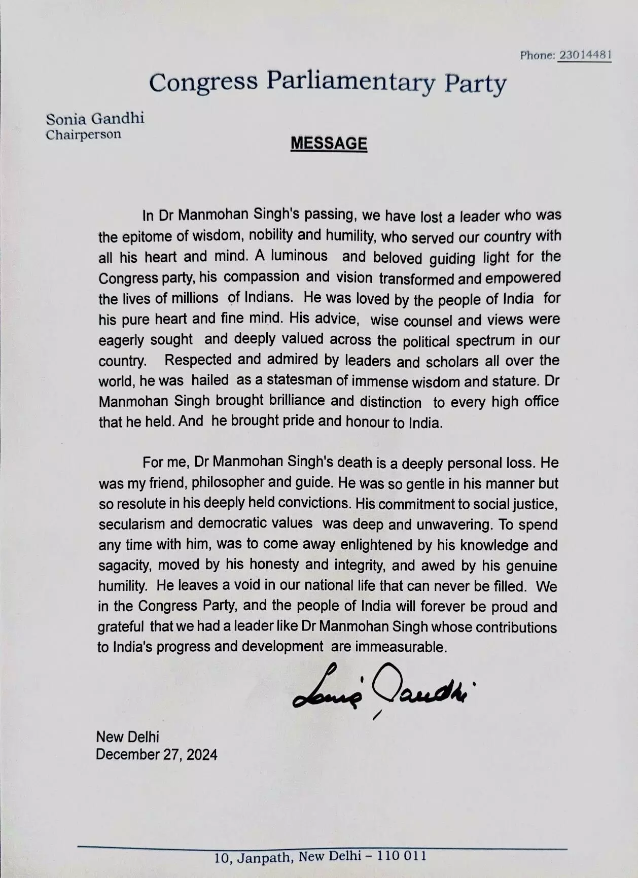 सोनिया गांधी के शोक संदेश को काँग्रेस ने अपने सोशल मीडिया प्लेटफॉर्म एक्स पर शेयर किया है l आज सोनिया गांधी ने मनमोहन सिंह के निधन पर शोक व्यक्त करते हुए कहा कि आज सब ने एक ऐसे नेता को खो दिया जो बुद्धिमान, कुलीनता और विनम्रता के प्रतीक थी l उन्होंने अपने दिल और दिमाग से देश की सेवा की l उन्होंने कांग्रेस पार्टी के लिए एक उज्ज्वल और प्रिय मार्गदर्शक, उनकी करुणा और दूरदर्शिता ने लाखों भारतीयों के जीवन को बदल दिया और उन्हें सशक्त बनाया l सोनिया गांधी ने अपने संदेश में लिखा कि भारत के लोग उन्हें उनके शुद्ध हृदय और उत्तम बुद्धि के लिए हमेशा प्यार करते थे l उनकी सलाह, बुद्धिमानीपूर्ण सलाह और विचारों को हमारे देश के राजनीतिक स्पेक्ट्रम में उत्सुकता से मांगा जाता था और उनका बहुत सम्मान किया जाता था l