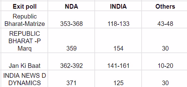 दो एग्जिट पोल के सारांश में अनुमान लगाया गया है कि सत्तारूढ़ राष्ट्रीय जनतांत्रिक गठबंधन (एनडीए) संसद के 543 सदस्यीय निचले सदन में 350 से अधिक सीटें जीत सकता है, जहां साधारण बहुमत के लिए 272 सीटों की आवश्यकता होती है। कांग्रेस पार्टी के नेतृत्व वाले विपक्षी दल भारत गठबंधन को 120 से अधिक सीटें जीतने का अनुमान है।