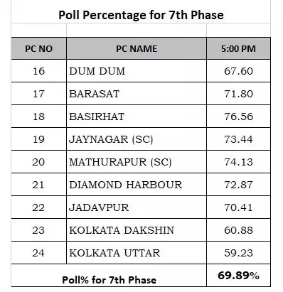 1 जून को लोकसभा चुनाव के सातवें और अंतिम चरण में 58.34% मतदान दर्ज किया गया, जिसमें पश्चिम बंगाल के संदेशखली क्षेत्र में टीएमसी और भाजपा समर्थकों के बीच हिंसा की घटनाएं सामने आईं और कुछ बूथों पर ईवीएम में गड़बड़ी और धांधली की शिकायतें दर्ज की गईं।