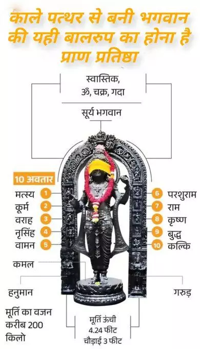 - रामलला की प्रतिमा एक ही काले रंग के पत्थर से बनी है, इसमें कोई जोड़ नहीं है।
