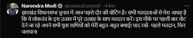 झारखंड विधानसभा चुनाव में आज पहले दौर की वोटिंग है। सभी मतदाताओं से मेरा आग्रह है कि वे लोकतंत्र के इस उत्सव में पूरे उत्साह के साथ मतदान करें। इस मौके पर पहली बार वोट देने जा रहे अपने सभी युवा साथियों को मेरी बहुत-बहुत बधाई! याद रखें- पहले मतदान, फिर जलपान!