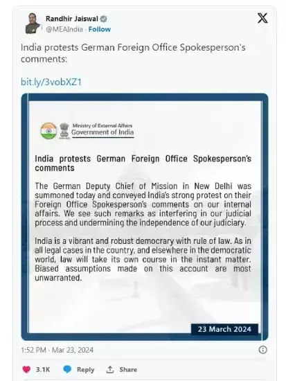 विदेश मंत्रालय ने इस संबंध में जानकारी साझा की है। मंत्रालय ने कहा है कि नई दिल्ली में जर्मन मिशन के उप प्रमुख जॉर्ज एन्ज़वीलर को आज बुलाया गया और हमारे आंतरिक मामलों पर उनके विदेश मंत्रालय के प्रवक्ता की टिप्पणियों पर भारत के कड़े विरोध से उन्हें अवगत कराया। साथ ही उनसे कहा गया कि भारत ऐसी टिप्पणियों को हमारी न्यायिक प्रक्रिया में हस्तक्षेप और हमारी न्यायपालिका की स्वतंत्रता को कमजोर करने के रूप में देखता है। भारत कानून के शासन वाला एक जीवंत और मजबूत लोकतंत्र है।