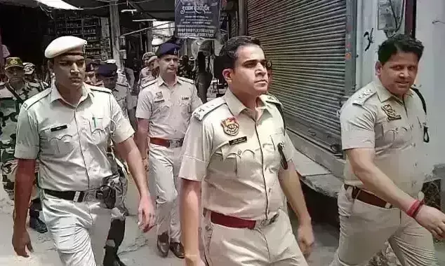 |पुलिस ने बीएसएफ के जवानों के साथ हथीन के गहलब रोड से मेन बाजार एवं लालदास मंदिर तक पैदल मार्च किया।