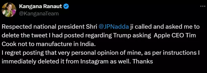विवाद बढ़ने पर कंगना ने एक और पोस्ट किया जिसमें उन्होंने बताया कि - "माननीय राष्ट्रीय अध्यक्ष श्री जे.पी. नड्डा जी ने मुझे फोन करके कहा कि मैं वह ट्वीट हटा दूं, जो मैंने ट्रंप के उस बयान पर किया था, जिसमें उन्होंने एप्पल के सीईओ टिम कुक से भारत में मैन्युफैक्चरिंग न करने को कहा था।